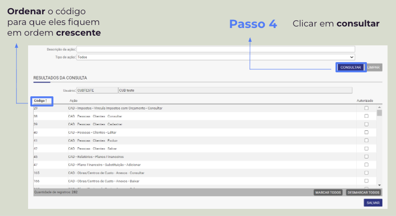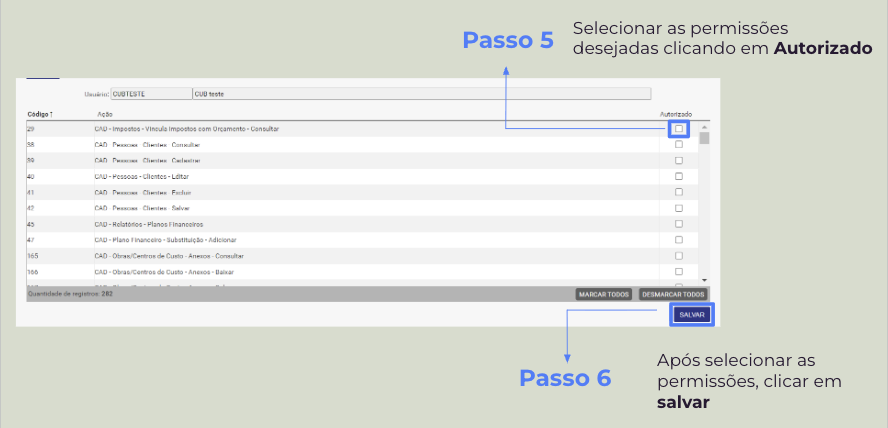 Repetir o processo dos passos anteriores até que todas as permissões presentes nos Itens de liberação de permissão do Sienge sejam atribuídas ao usuário criado.