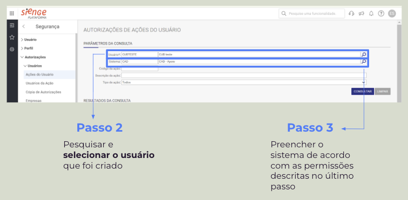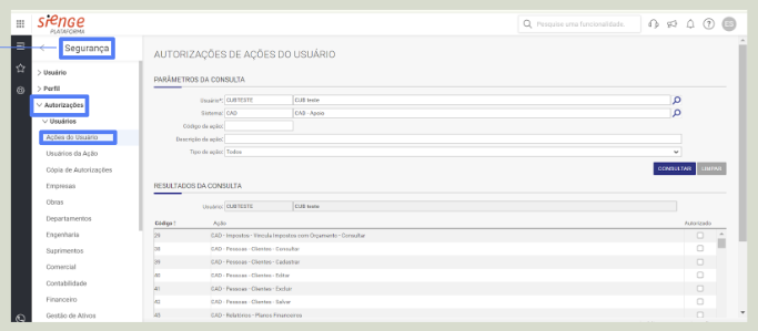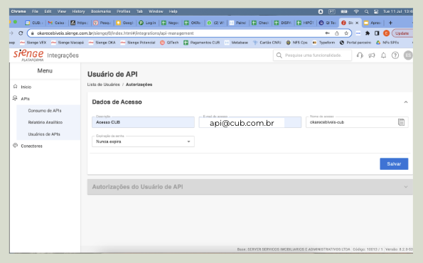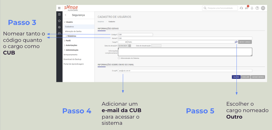 - Liberação de usuário: também será necessário criar um usuário exclusivo para uso do Sienge pela CUB. Além da criação do usuário, também precisamos que sejam dadas as permissões necessárias.