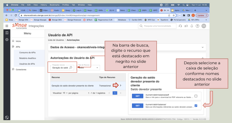 Na seção de Autorizações do Usuário de API você precisará buscar os 10 recursos abaixo e, dentro deles, selecionar itens que devem ser liberados através das caixas de seleção.